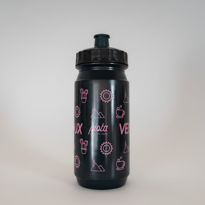 Bidon durable et résistant de 550ml vert forêt avec les pictogrammes de Pista en motif rose. Bouchon noir.