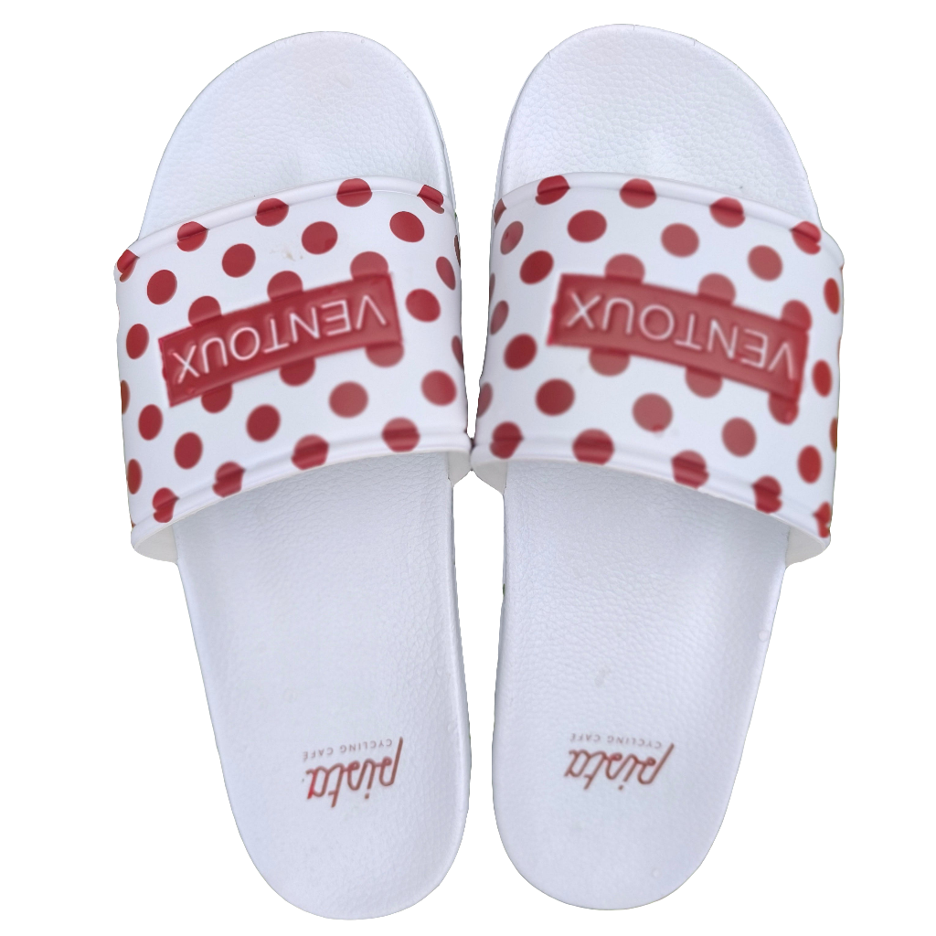 Claquettes Grimpeur Ventoux, blanches et rouges style maillot à pois.